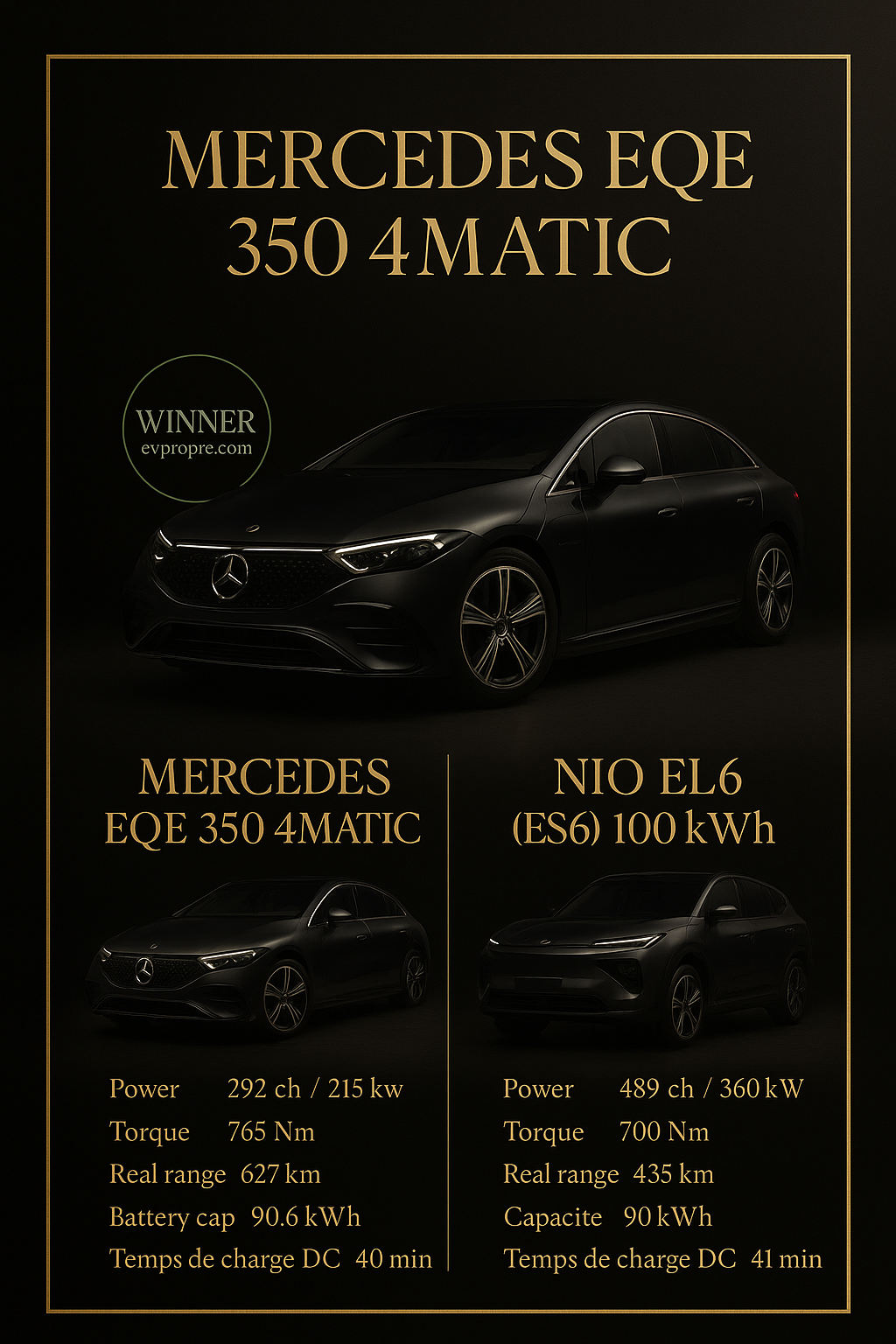Quel est le positionnement prix de chaque modèle et pour quel public sont-ils destinés ?Les informations de prix ne sont pas fournies, mais généralement, la Mercedes EQE 350 4MATIC pourrait être positionnée dans une gamme de luxe, attirant les clients recherchant confort et autonomie. La NIO EL6 (ES6) 100 kWh, avec ses performances élevées, pourrait séduire les amateurs de technologie et de conduite dynamique.